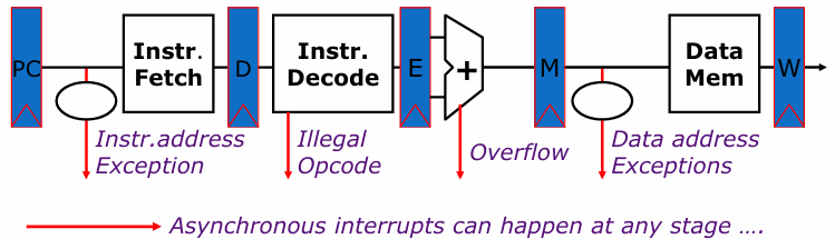 In a pipelined processor, where multiple instruction stages may be processed in parallel, handling synchronous interrupts becomes more complicated. If an interrupt occurs, the processor must undo the effects of one or more partially executed instructions in the pipeline, ensuring that no incorrect results propagate through the system. This action requires specific mechanisms to ensure the integrity of the processor’s state is maintained and that the execution flow can return to a consistent point after handling the exception.