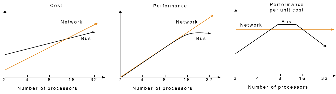 From a cost-performance perspective, there is a notable trade-off between single-bus and network-connected multiprocessor designs.