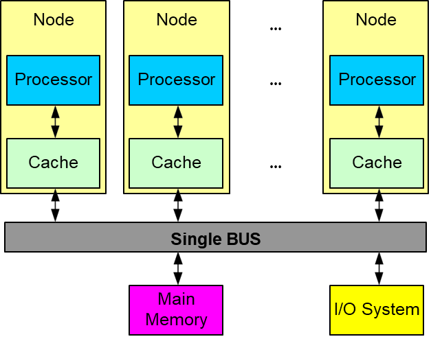 This design is simple and cost-effective for a small number of processors. However, the bus quickly becomes a point of contention as more processors are added. In commercial systems, the largest practical number of processors connected via a single bus is around 36. Beyond this point, the bus becomes saturated, and system performance plateaus regardless of the number of additional processors.