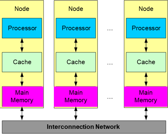 Distributed memory architectures take the decentralization of memory even further. Instead of sharing a unified address space, these systems are built from clusters of independent computers, each equipped with its own private memory and processing unit. These nodes communicate by exchanging messages across a scalable interconnection network. This design is at the core of message-passing architectures, which are especially effective in large-scale distributed computing environments such as high-performance clusters and supercomputers. Unlike DSM systems that maintain a global address space, distributed memory systems require explicit communication primitives—typically implemented using libraries such as MPI (Message Passing Interface)—to coordinate tasks and exchange data among nodes.