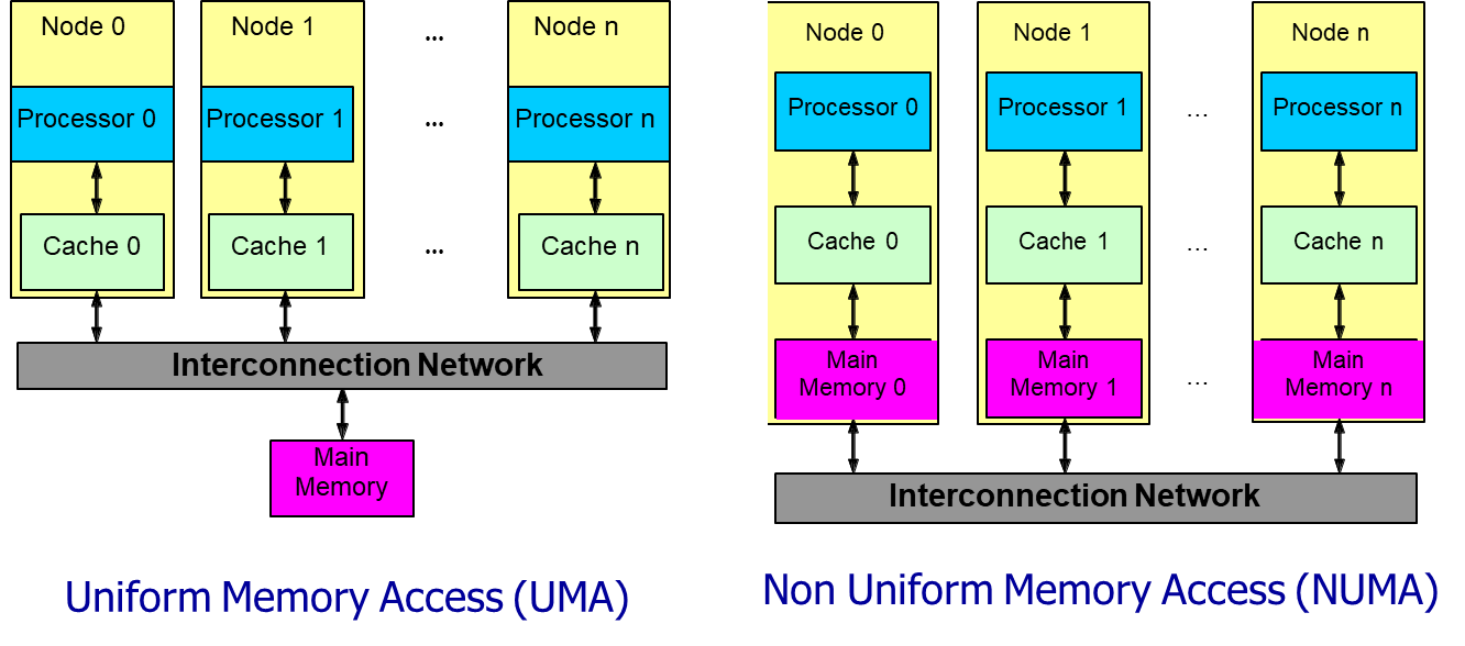 - Physical Organization: Memory can be centralized (UMA), with uniform access time for all processors, or distributed (NUMA), where accessing local memory is faster than remote memory.