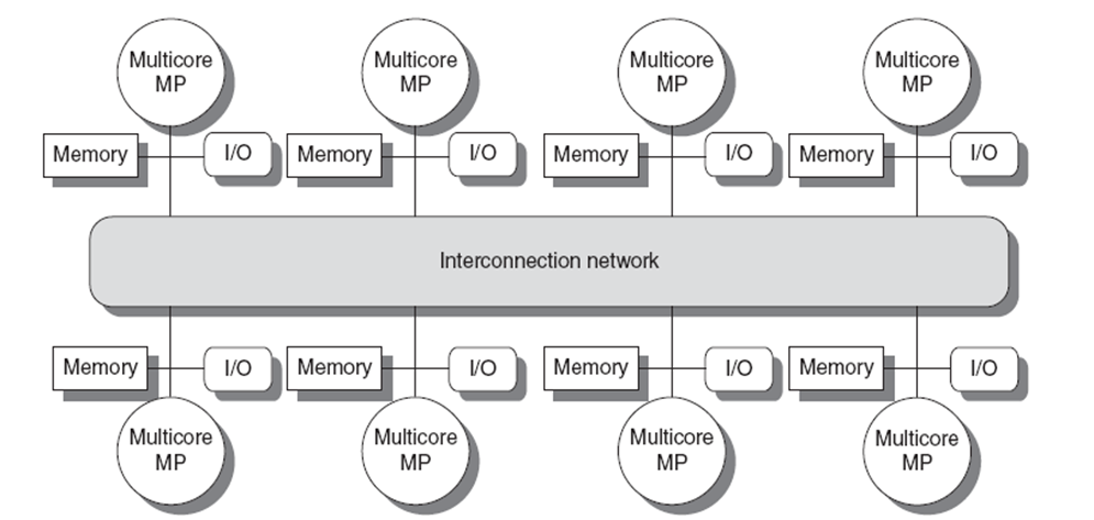 - Centralized Shared Memory (SMP): Common in small multicore chips, uses UMA and snooping protocols for cache coherence.