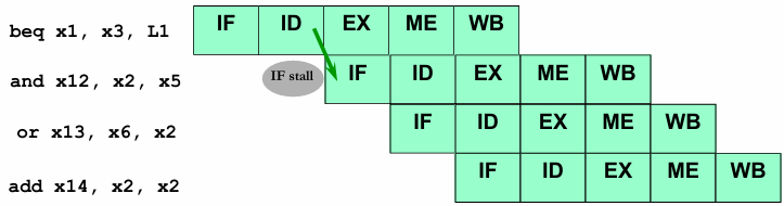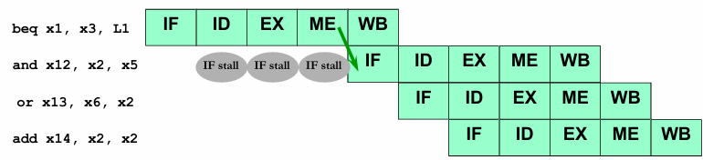 A straightforward but inefficient solution to control hazards is to stall the pipeline until the branch resolution is complete. In a standard five-stage MIPS pipeline, the branch outcome is determined at the Memory (ME) stage, which means a naive approach would introduce a 3-cycle stall every time a branch instruction is encountered. This significantly reduces the ideal speedup provided by pipelining.