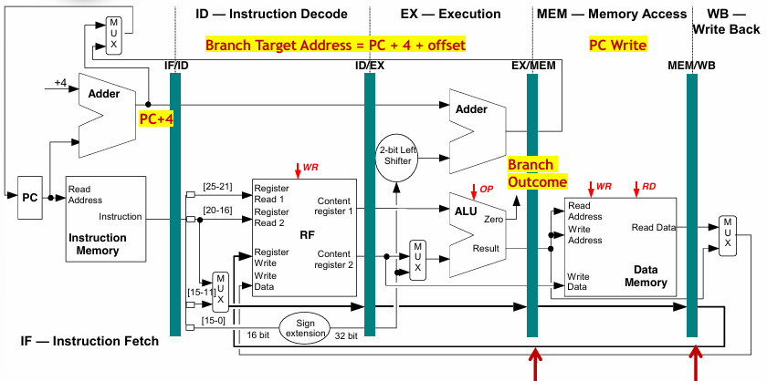 PC + 4 + offset. - Memory Access (ME): At this stage, the Branch Outcome is applied to update the Program Counter (PC):