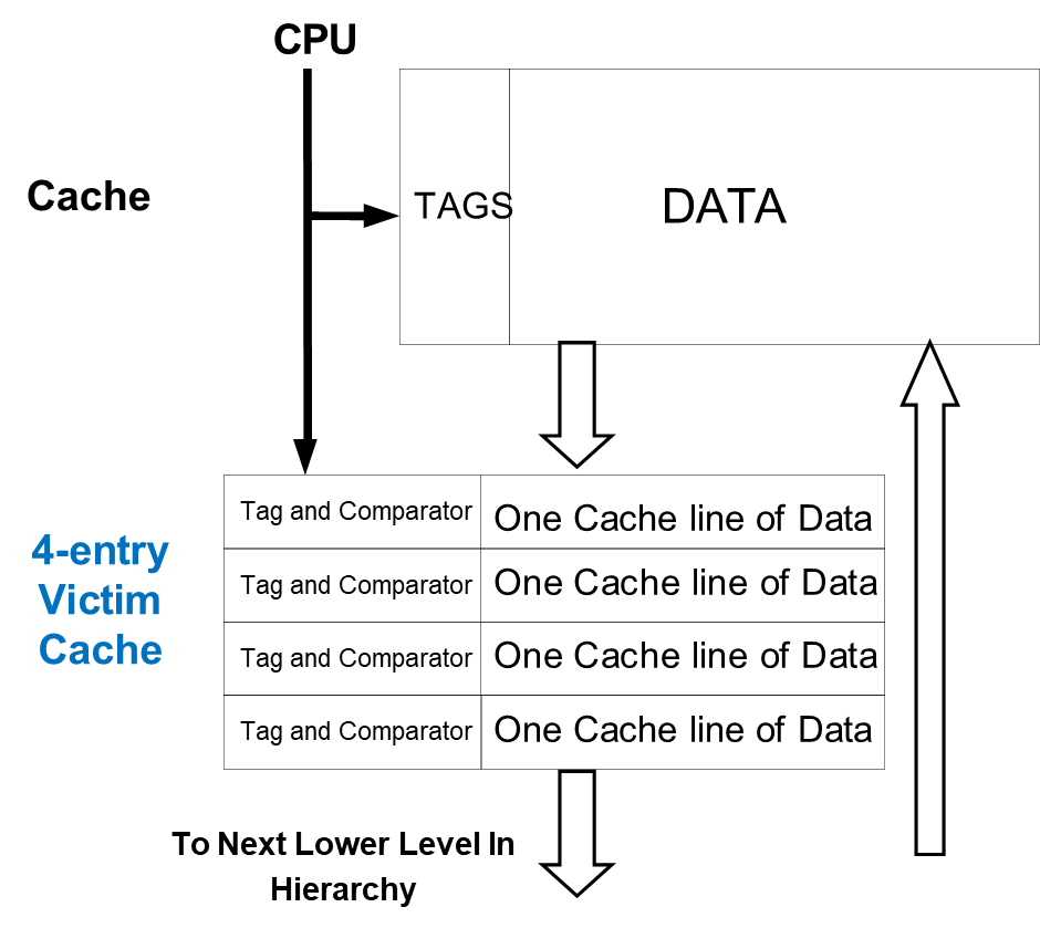 To address both conflict and capacity misses, some systems implement a victim cache, a small fully associative cache placed between the primary cache and the next lower level in the memory hierarchy. When a block is evicted from the main cache, it is stored temporarily in the victim cache. On a subsequent miss, the system first checks this victim cache before proceeding to the lower memory levels. If the block is found there, a block swap occurs between the main and victim cache, exploiting temporal locality. This strategy effectively gives a “second chance” to recently evicted data and is particularly beneficial in workloads with frequent data reuse.