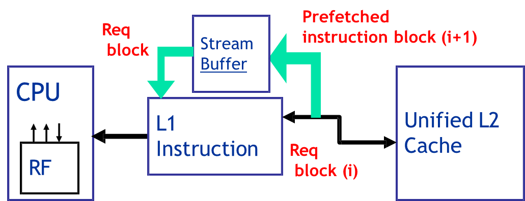 is requested and not found in the instruction cache, the processor retrieves both block and block . The requested block is placed into the instruction cache, while the next block is stored in a dedicated instruction stream buffer (I-stream buffer). If a subsequent access misses the cache but hits in the stream buffer, the data can be retrieved much faster than from main memory. Additionally, the pre-fetch mechanism continues by fetching block , maintaining a pipeline of anticipated accesses.
