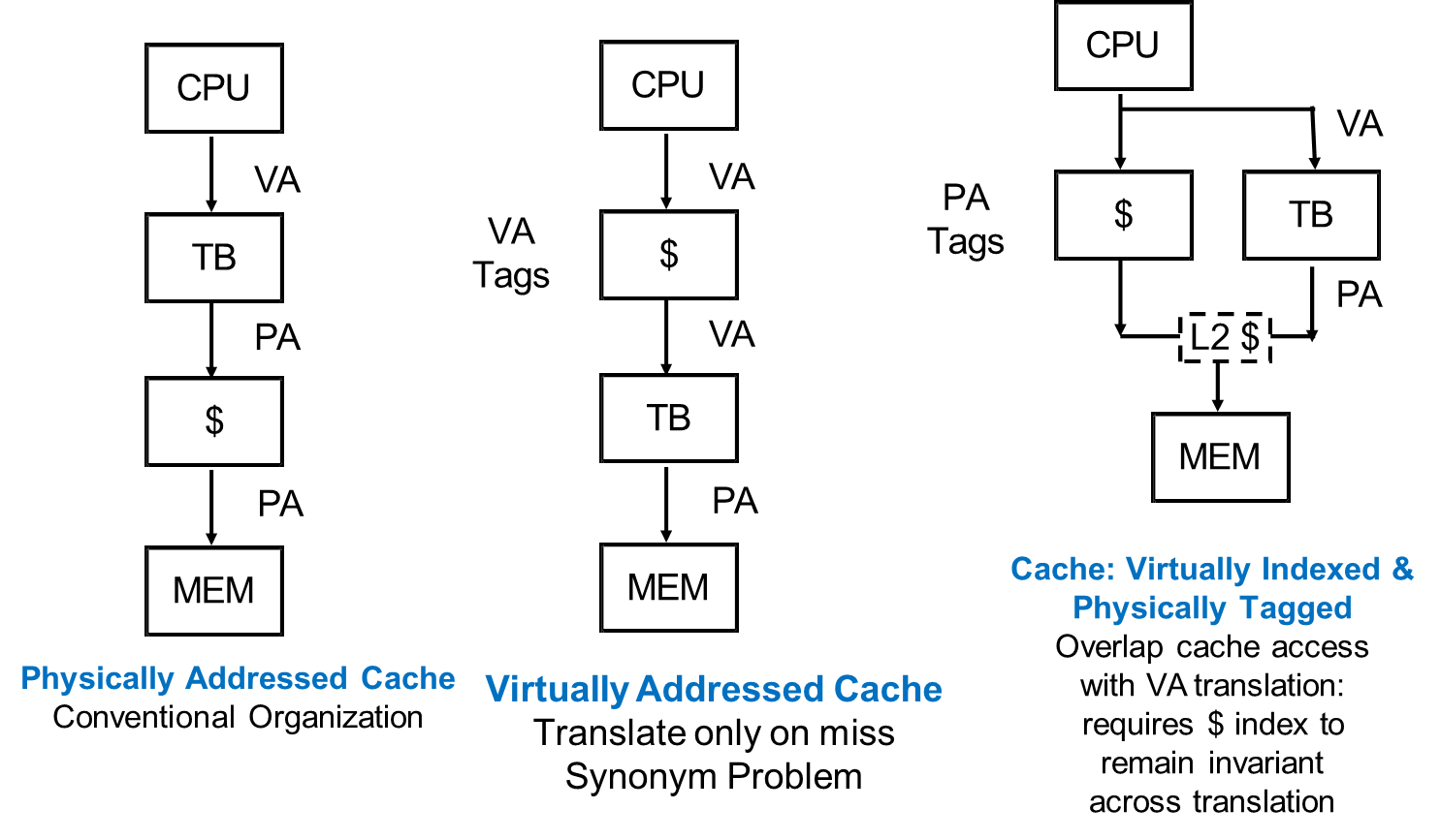 - Address aliasing: This occurs when two different virtual addresses map to the same physical address. If both addresses are cached, it can lead to inconsistencies and coherence issues, as the cache may not be able to distinguish between the two.