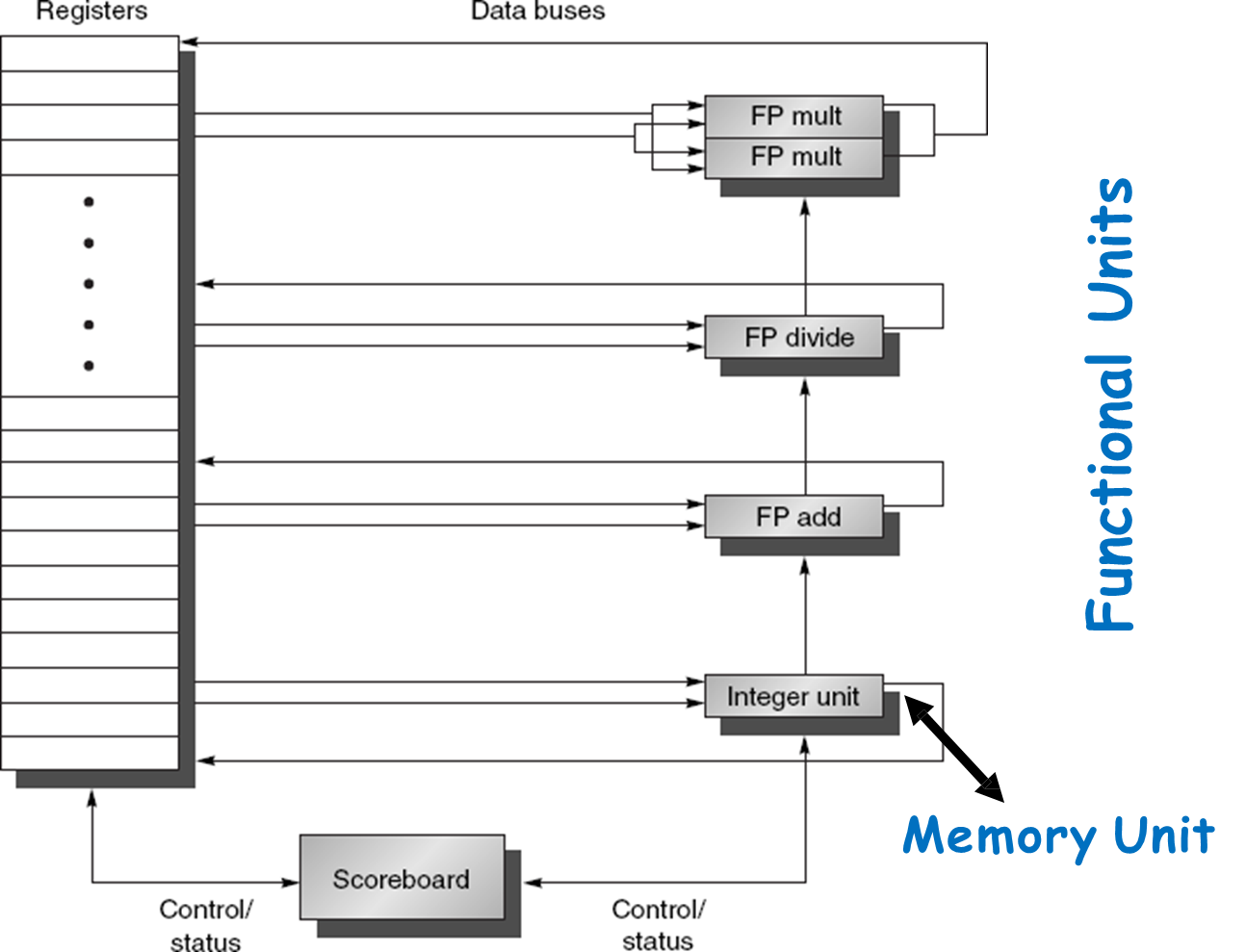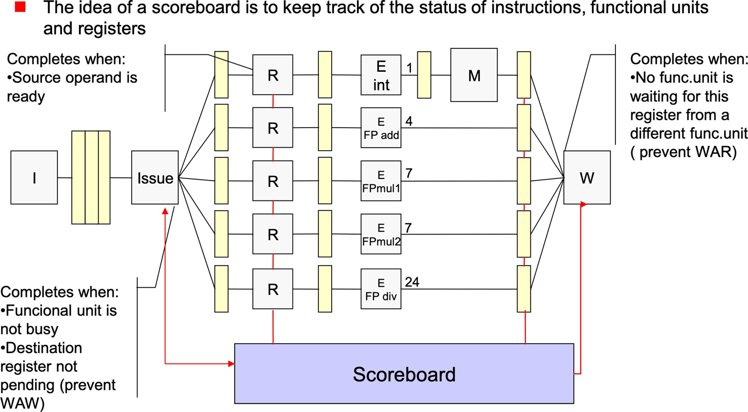 This division allows instructions to execute as soon as conditions 1 and 2 are satisfied, without waiting for previous instructions to complete. The Scoreboard continuously tracks dependencies and the state of ongoing operations, dynamically resolving conflicts and ensuring execution progresses efficiently.