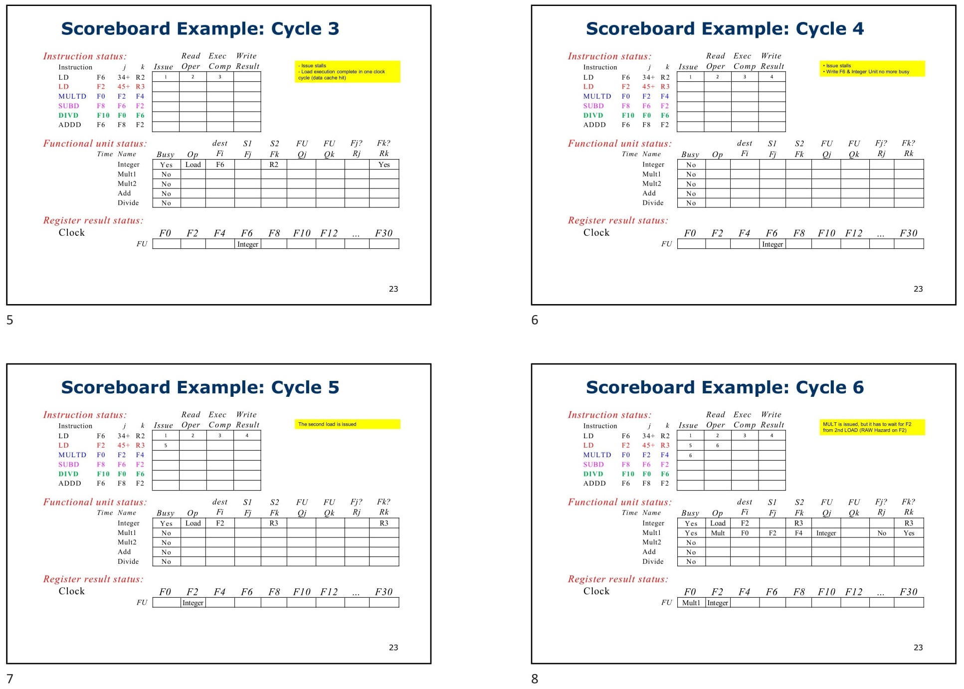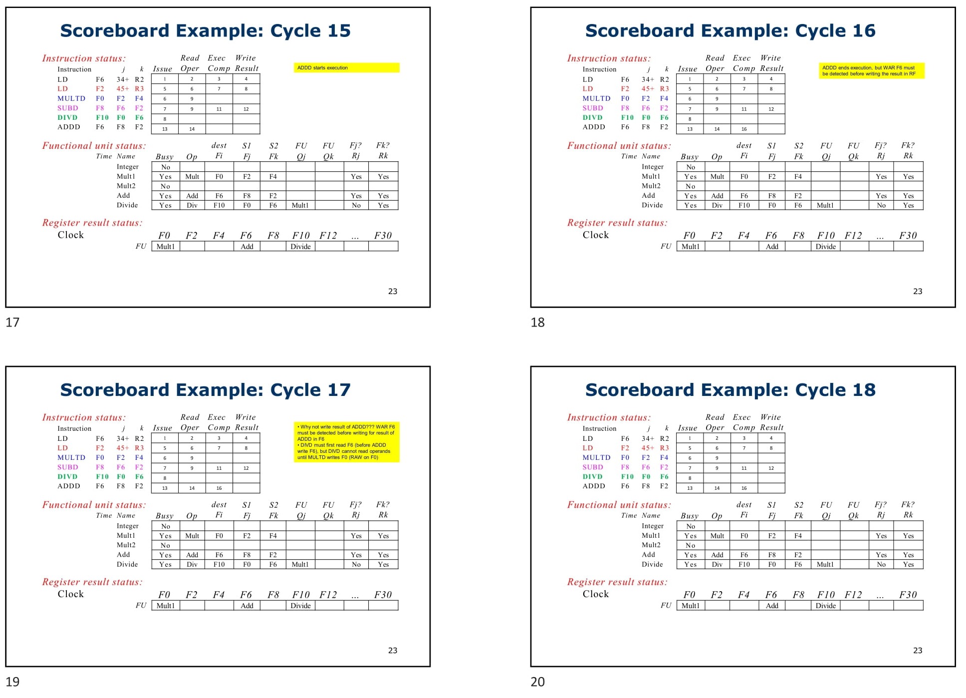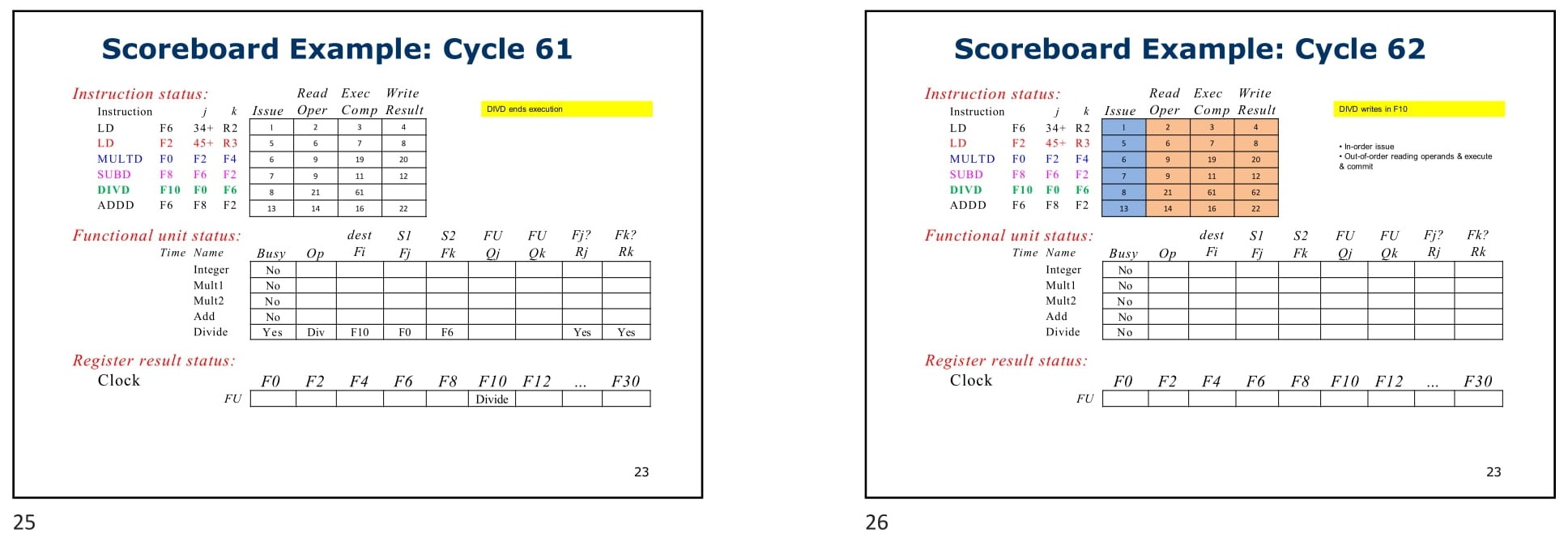 - Write-After-Write (WAW) Hazard: This occurs when two instructions write to the same register in an overlapping manner. The Scoreboard detects this hazard and stalls the issue of the newer instruction until the previous instruction completes its write operation.