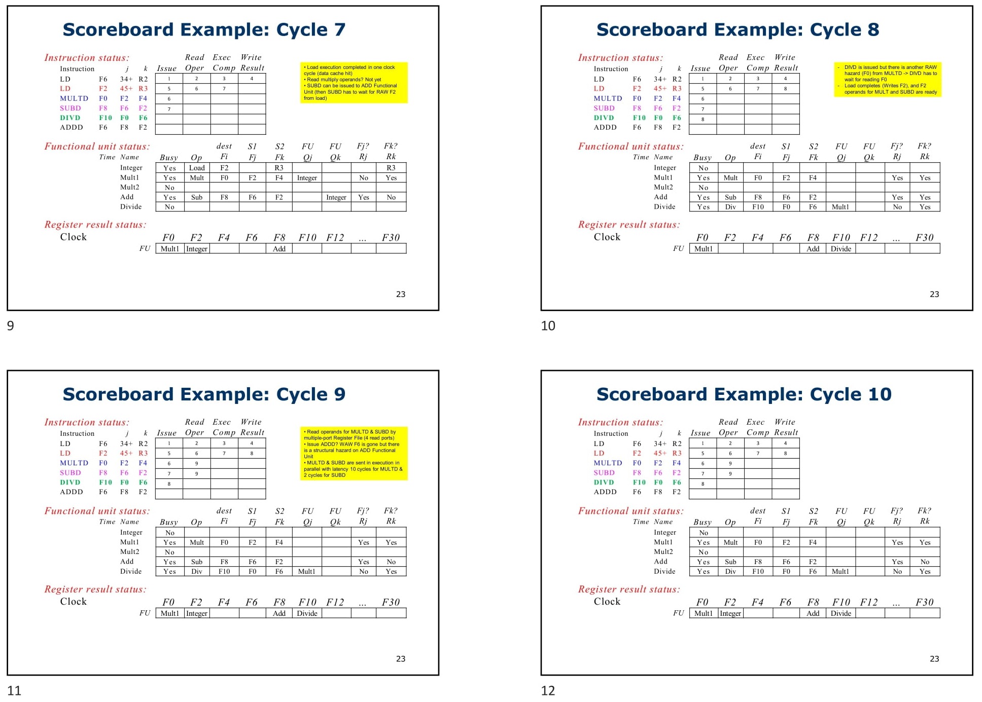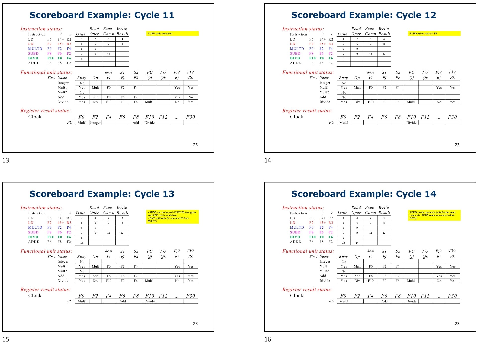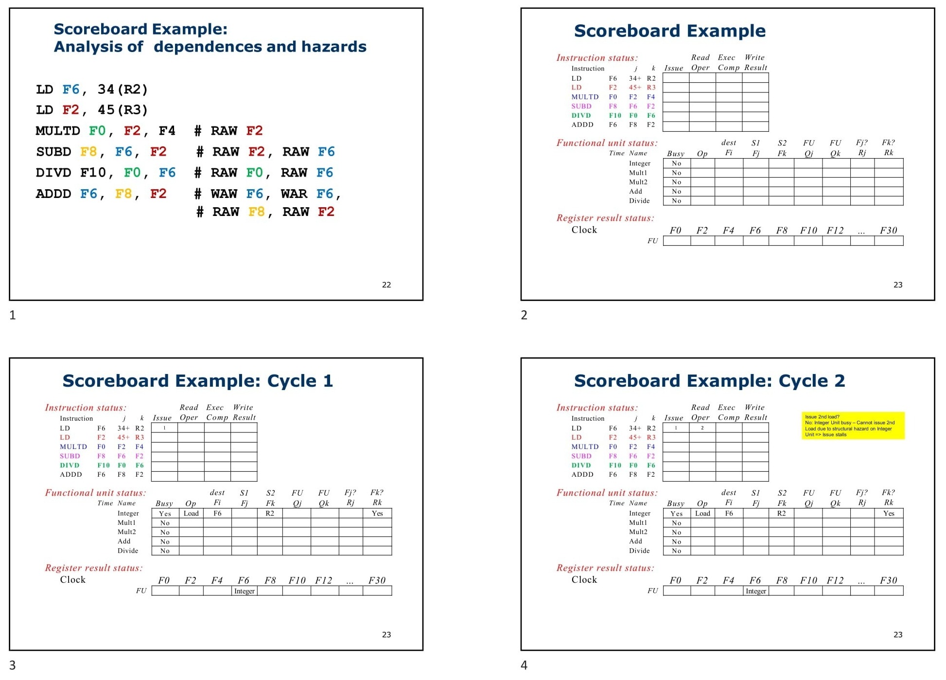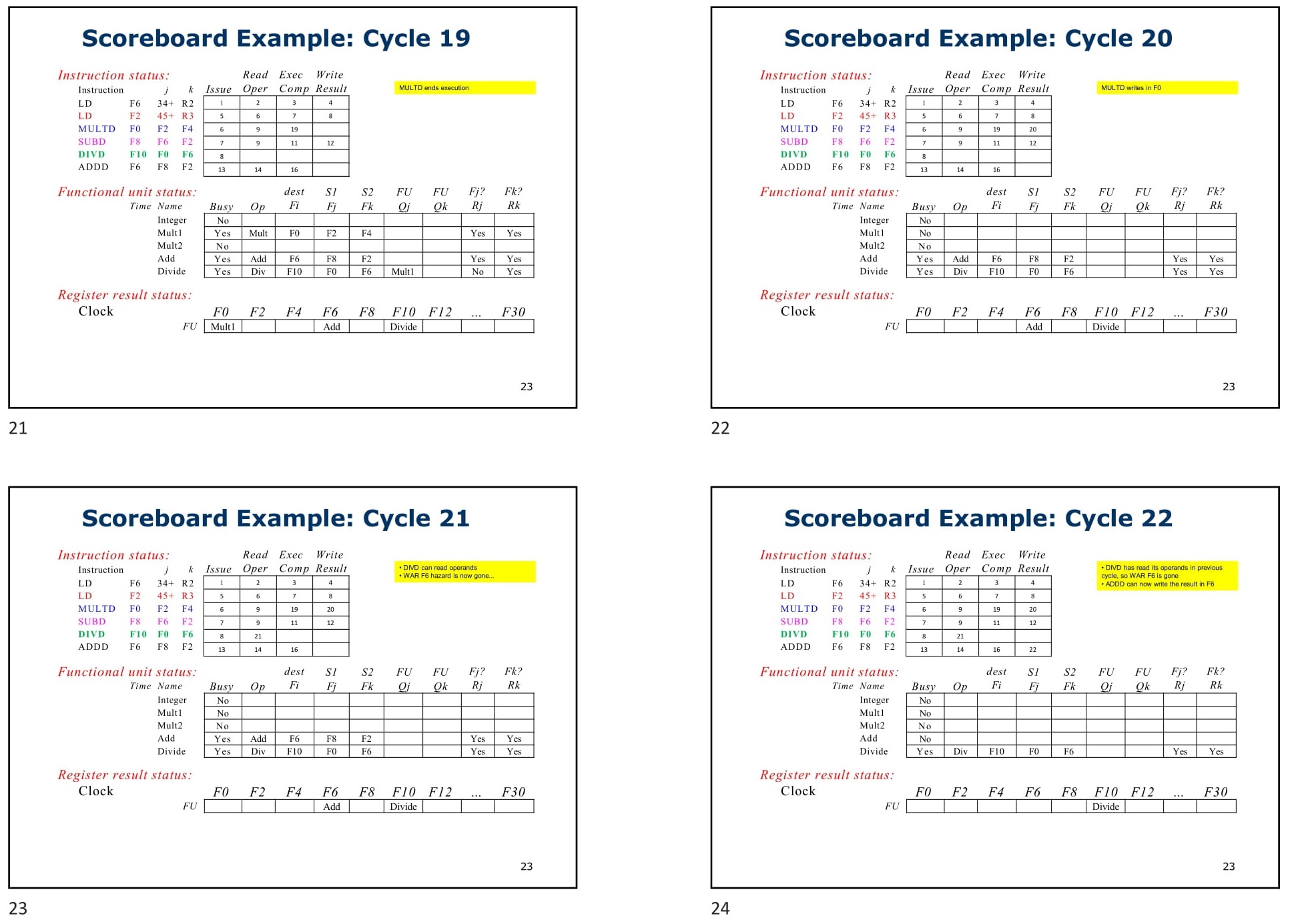 - Write-After-Write (WAW) Hazard: This occurs when two instructions write to the same register in an overlapping manner. The Scoreboard detects this hazard and stalls the issue of the newer instruction until the previous instruction completes its write operation.