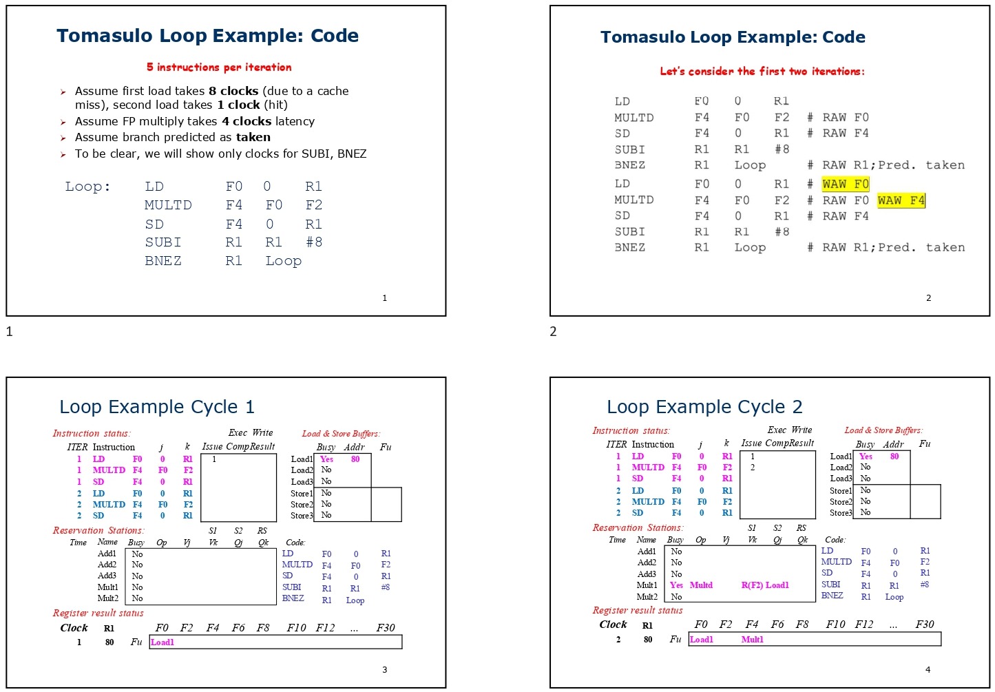Compiler transformations and register renaming are essential techniques used to mitigate Write After Read (WAR) and Write After Write (WAW) hazards. These hazards often occur during instruction execution due to data dependencies or resource conflicts, particularly in pipelined processors. While the Tomasulo algorithm employs dynamic register renaming using reservation stations to handle these hazards at runtime, compilers can apply static transformations to achieve similar results. By applying techniques such as register renaming and loop unrolling, compilers can optimize the instruction sequence and enhance instruction-level parallelism (ILP).