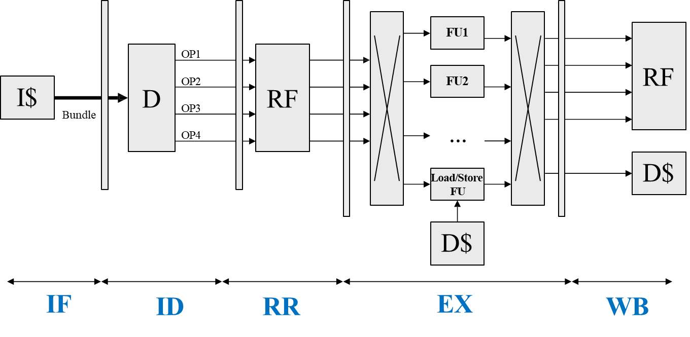 Register Read (RR): Accesses a shared, multi-ported Register File (RF) to read the source operands. For a processor with 4 slots, this usually requires 8 read ports and 4 write ports to support parallel access.