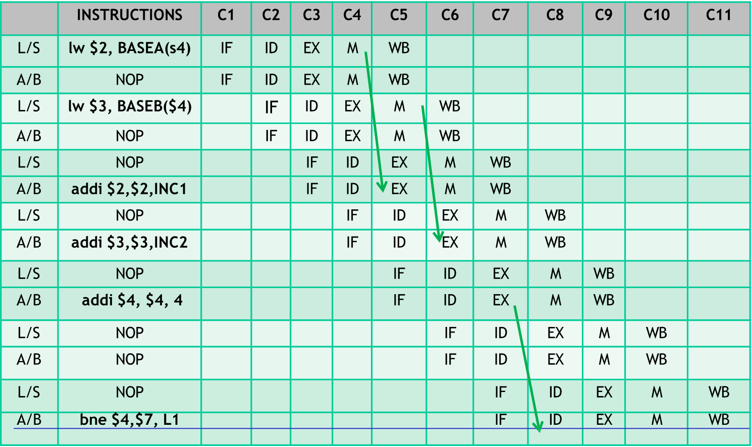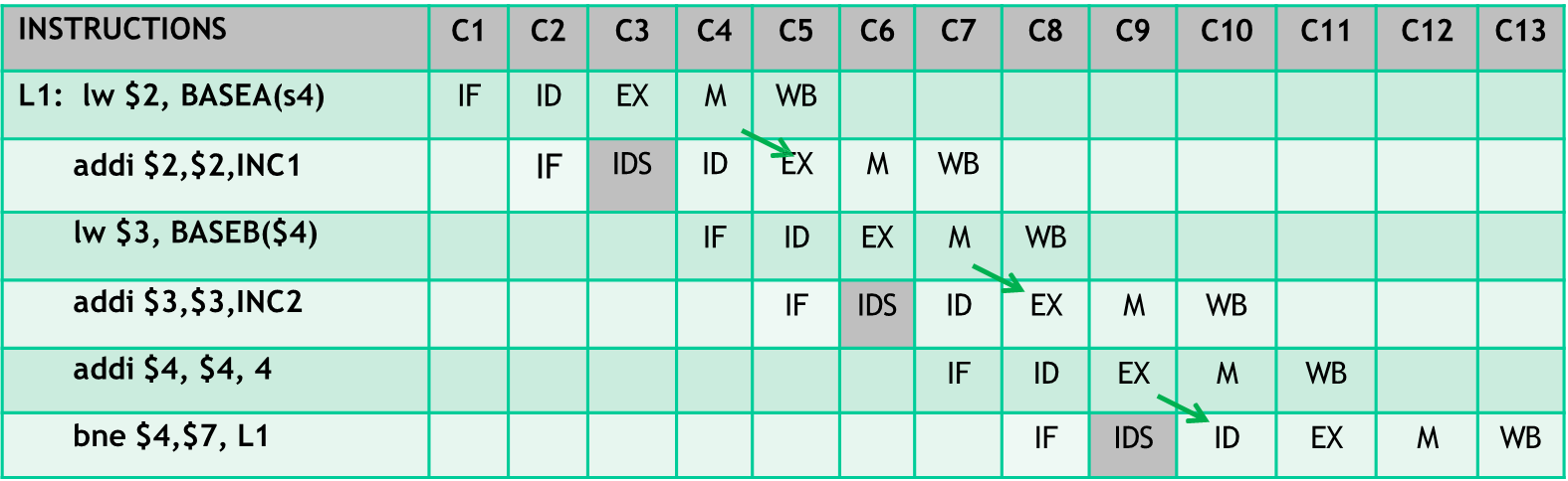 L1: LW $2, BASEA($4) ADDI $2, $2, INC1 ; RAW $2, WAW $2 LW $3, BASEB($4) ADDI $3, $3, INC2 ; RAW $3, WAW $3 ADDI $4, $4, 4 ; WAR $4 BNE $4, $7, L1 ; RAW $4