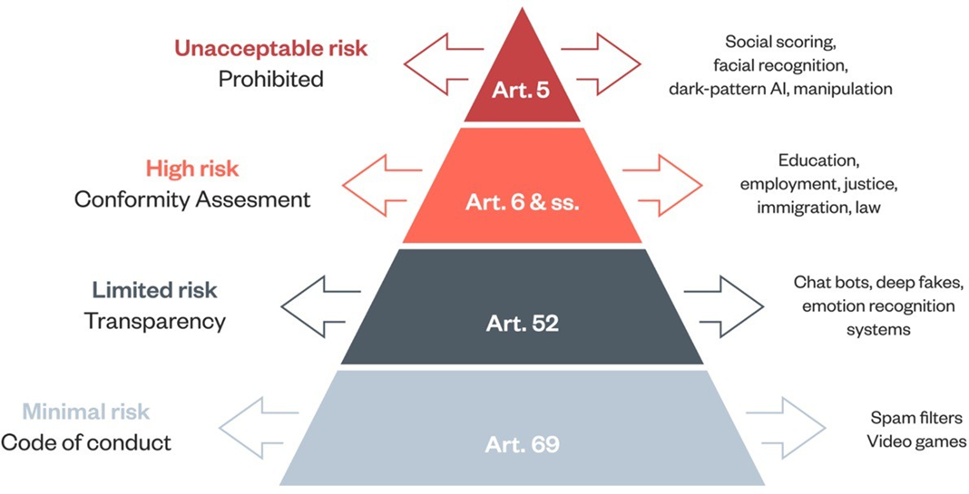 The four-tiered pyramid of the AI Act is structured as follows, moving from the most to the least regulated applications:
