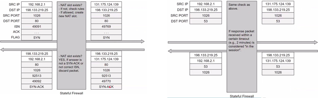 Stateful packet filters allow session handling. A session is an atomic, transport-layer exchange of application data between 2 hosts. The main transport protocols are TCP (Transmission Control Protocol, where session = TCP connection) and UDP (User Datagram Protocol, where session concept does not exist, connectionless). Session-handling is fundamental for NAT, session is emulated in UDP case in fact. Being UDP widely used, we can’t dismiss it (e.g. DNS, VoIP H.323, video streaming, etc) so it must be managed. It is however difficult to secure and handle, because it is connectionless.