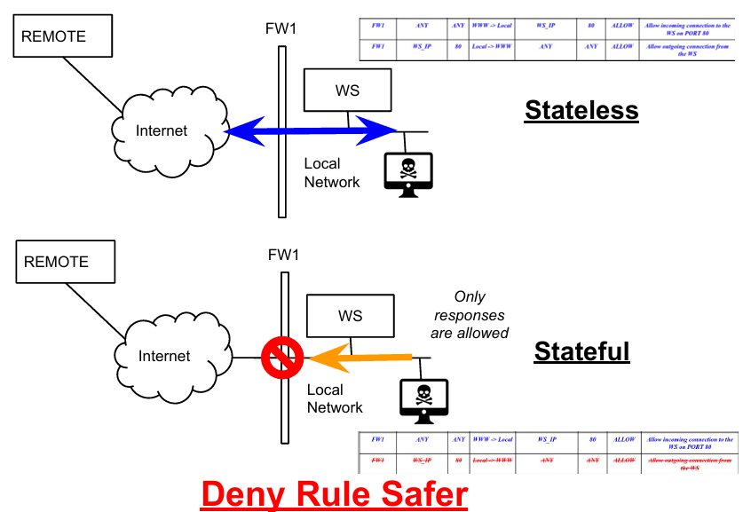 Packet filters have some additional functionalities that allow to track the connection and the TCP state machine, together with the relation between packets. They keep track of the TCP state machine, after SYN signal, SYN-ACK must follow, and to track connections without adding a response rule and make deny rule safer. This has huge impacts on how rules are written: since the connection is tracked, there is no need to implement a rule to allow the response. Also, deny rule is safer because less things are allowed, an internal attacker can not exfiltrate information, because there is no move from internal to external (response rule).