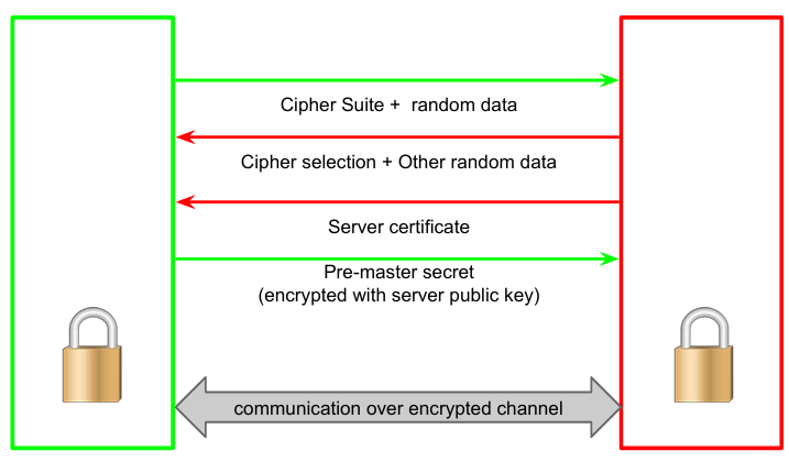 The client sends a list of algorithms divided by functionality and the server selects the first one compatible. The standard mandates implementation of a minimal cipher setting to guarantee connection in any case. The server will select the suite and send the client its cipher selection and some other random data together with the server certificate containing its public key. At this point the server certificate must be verified: is the certificate in the validity period? Is the root CA trusted? Is the certificate valid? Is it revoked? Is the name of the server in the certificate the same that was requested? Validity of the certificate and certification chain can always be checked while browsing the internet. If the certificate is valid the client can server the pre-master (first) secret, encrypted with server public key. An attacker cannot read it easily, because only the server (with its private key) can decrypt it. From this point on the exchanged information is encrypted. During this step the client can optionally send its client certificate (authenticate by signing with private key).