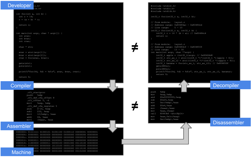 The high level code obtain out of the decompiler is different than the original one, because the compiler introduces some optimizations that change the code’s layout. It will thus be less readable than the original one. Moreover, all the variables’ names are lost and the disassembler can interpret some data as instructions, the compiler in fact may change the used instructions. It is not possible to perfectly reverse a binary file. The result is less readable than the original high level code.