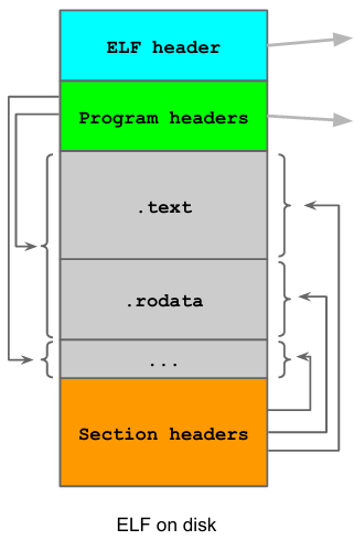 - ELF header: contains all the high level structures of the binary, defines file types and boundaries of the section and program headers (i.e. where other headers are located)