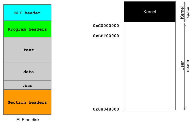 The following concepts apply, with proper modifications, to any machine architecture/operating system/executable. For simplicity, the ELF binary file running on Linux (>=2.6 processes) on top of a 32-bit x86 machine will be considered.