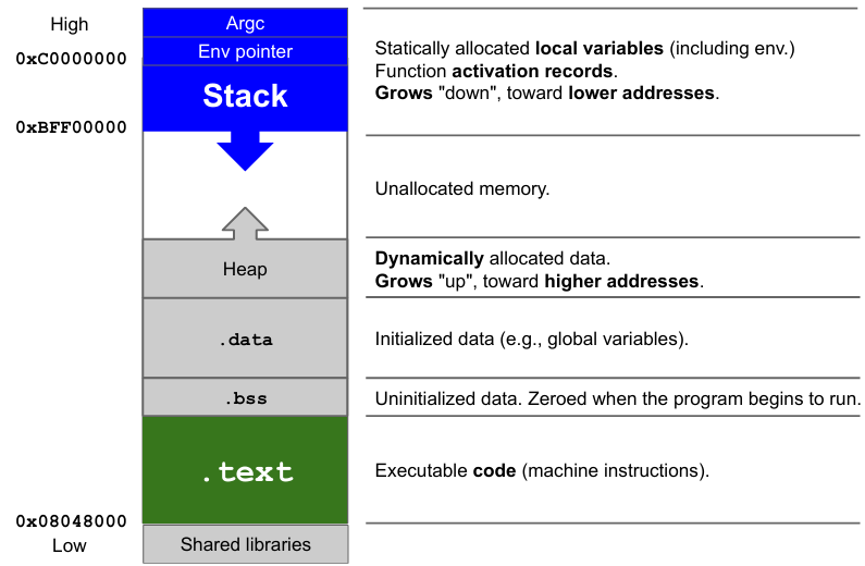 - Stack: statically allocated local variables (including environment variables), function activation records, grows down toward lower addresses