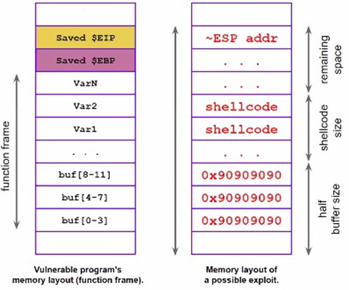 Let’s consider this last case, assuming that the overflowed buffer has enough room for the arbitrary machine code. Let’s consider a buffer that contains any kind of malicious code: the buffer’s address must be found. How to find the buffer’s address? The buffer is a variable, so it must be on the stack.