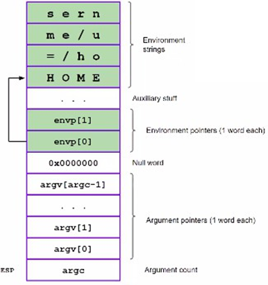 The command env prints all environmental variables. Any called program (in memory) will have a pointer for each of them. If memory is not executable, the CPU will assume everything the memory contains is data. To put in place an exploitation using environmental variables