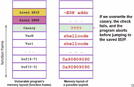 An example of the last one is the canary mechanism, i.e. verifying during the function’s epilogue that the frame has not been tampered with. A canary is usually inserted between local and control variables (saved EIP/EBP). When the function returns, the canary is checked and the program is killed if tampering is detected (e.g. StackGuard).