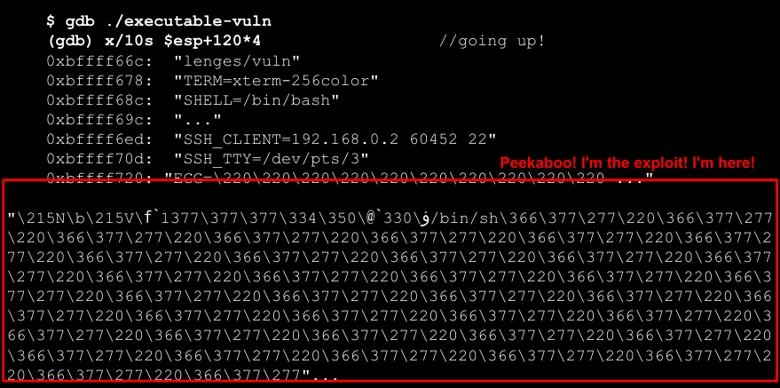 Launching gdb starting from ESP, at some point environmental variables will be printed, including the one containing the shellcode and its address. In this case the purpose is to jump to an address that contains only nop opcodes, in the middle of the sled. Just as before, the exploitable program will be passed an input containing the selected address repeated many time (overwriting whatever is on the stack with it to be sure to overwrite the saved EIP, to get to the envar in the end).