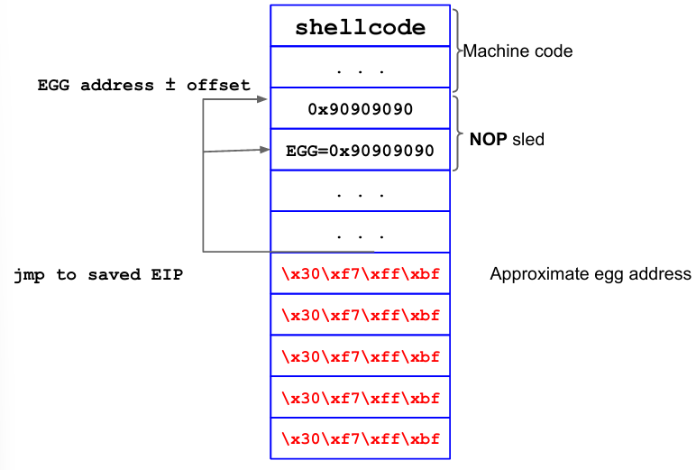 To solve such issues the nop (0x90) instruction can be used. The purpose is to be able to jump on a valid instruction. nop is a 1 byte valid instruction that tells the CPU to jump to the next instruction. If many of these are used to fill the buffer before the saved EIP, a nop sled is created and the CPU will always execute a valid instruction in the end. In this case the offset should be guessed: it is usually convenient to put a long sled of nop and then jump somewhere in the middle. The nop sled is a landing strip: by “falling” anywhere a valid instruction is found. Eventually the end of the sled is reached and the executable (malicious) shell code is executed. The code is composed of a lot of nop and the malicious code, until EIP is overwritten.