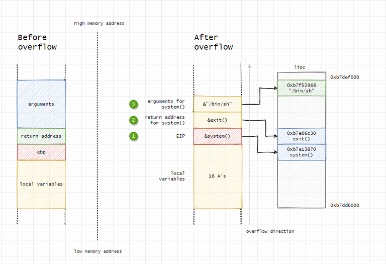 argvargument. Each program receives them, and there is almost infinite space to put malicious code. To exploit them the memory must be prepared to put the shellcode there and then jump. - built-in, existing functions: instead of jumping to a memory area, this consists of jumping to the address of an existing function (e.g. system function: