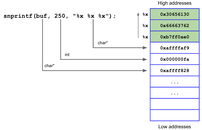 snprintf(buf, 250, "%i, %i, %i", a, b, c); // non vulnerable snprintf(buf, 250, "%x, %x, %x"); // vulnerable