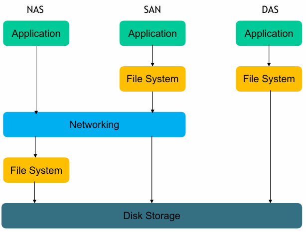 - Direct-attached storage (DAS): a storage system directly attached to a server or workstation. They are visible as disks/volumes by the client OS
