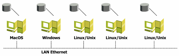 This type of storage system is the simplest one and is used in small environments where scalability (very limited) and management (complex) are not a priority. However, the performance are pretty limited and to read the files in other machines, there must be a sharing protocol (e.g., NFS, SMB, FTP) enabled that the OS can use to access the files.