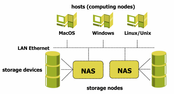 - Network-attached storage (NAS): a computer connected to a network that provides only file-based data storage services (e.g., FTP, Network File System and SAMBA) to other devices on the network and is visible as File Server to the client OS