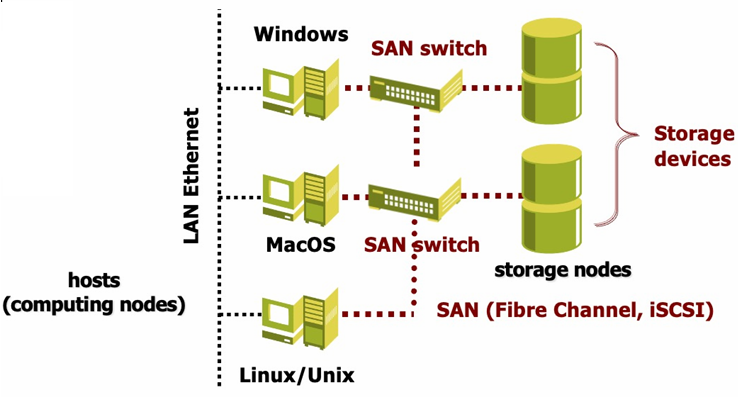 SANs have a special network devoted to access to storage devices, one TCP/IP network for the clients and another network for the storage devices based on fiber channel. This solution provides high scalability, by increasing the storage devices connected to the SAN, and high performance, by using a dedicated network for the storage devices.