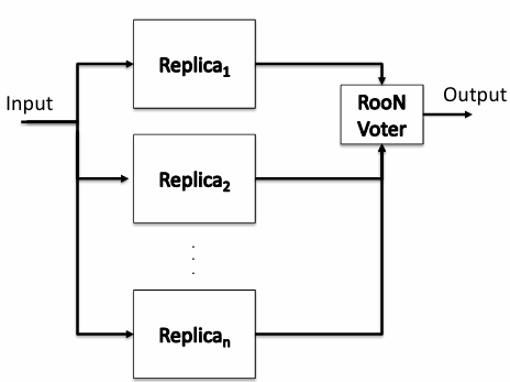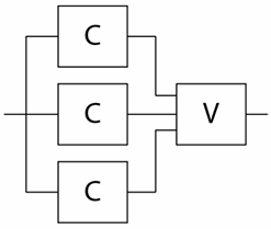 TMR is a redundancy scheme where the system works properly if 2 out of 3 components work properly and the voter works properly.