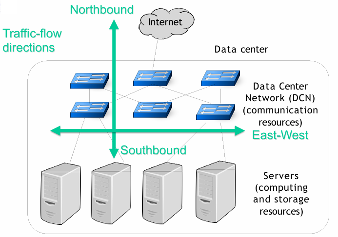 While the northbound traffic is the traffic that goes from the servers to the internet, there is another type of traffic called east-west traffic, which is the traffic that goes from one server to another server within the data center. This traffic is completely hidden to the user and it’s used for storage replication, VM migration, and network function virtualization, a process where data is processed through a sequence of VMs. The east-west traffic is usually larger than the north-south traffic and it’s a critical component of a data center network; about 76% of the traffic in a data center is east-west traffic in comparison to 17% of north-south traffic in a data center.
