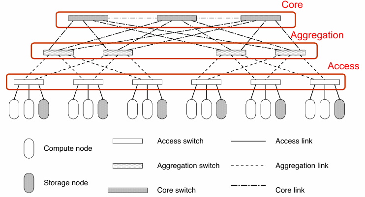 - Access layer: where the servers (compute and storage nodes) are connected to the network through access switches. Each access-level switch is connected to at least two aggregation-level switches.