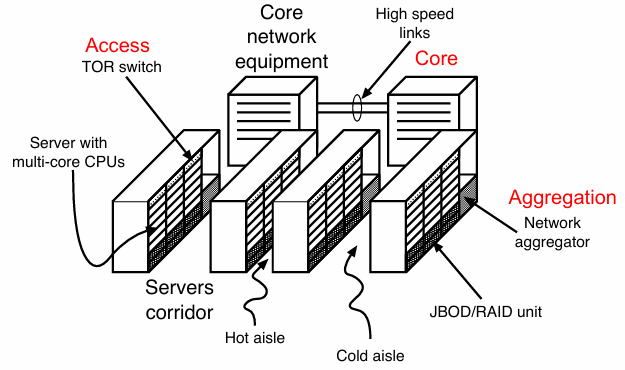 This architecture reflects the topology of the data center where each computational node inside the corridor is connected to TOR switches (access switches) and the TOR switches are connected to network aggregators (aggregation switches) placed at the end of the corridor. Each aggregator is connected to the core network equipment (core switches) through high-speed links.