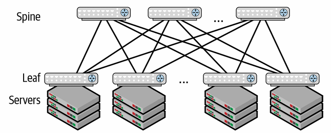 The spine-leaf topologies are borrowed from the telephone world and they are used in data center networks to provide a scalable and cost-effective solution. This is a non-folded Clos structure that uses leaf switches (ToR switches) and spine switches (aggregation switches) to provide a high level of performance and scalability.