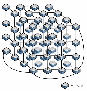 CamCube is a server-centric architecture proposed for building container-sized data centers. It may reduce implementation and maintenance costs by using only servers to build the DCN. It uses a 3D-Torus topology to interconnect the servers directly and, as a torus-based architecture, it exploits network locality to increase communication efficiency.