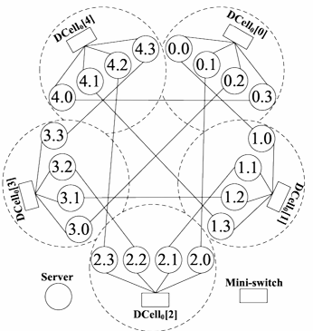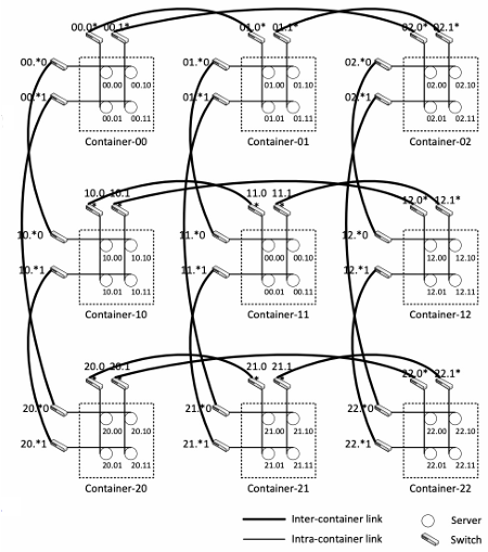 It’s designed to reduce the number of cables in the interconnection of containers. Each container had an ID mapped to a multidimensional tuple and connected to the neighbor container with different tuple in one dimension. There are two types of links: intra-container links and high-speed inter-container links.
