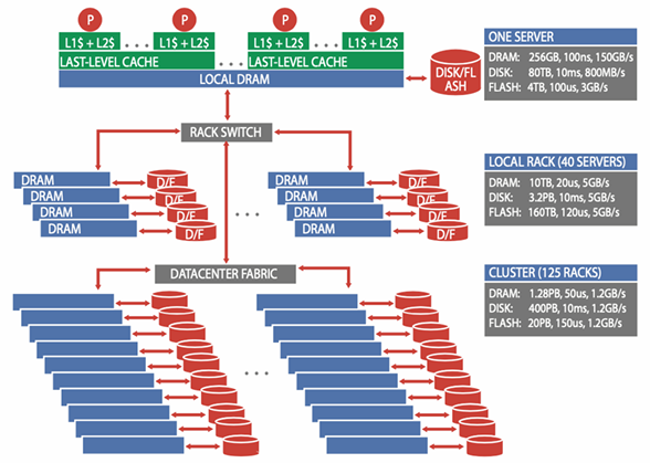 Network latency numbers assume a TCP/IP transport, and networking bandwidth values assume that each server is using its fair share of the available cluster-level bandwidth. For disks, typical commodity disk drive (SATA) latencies and transfer rates are considered.