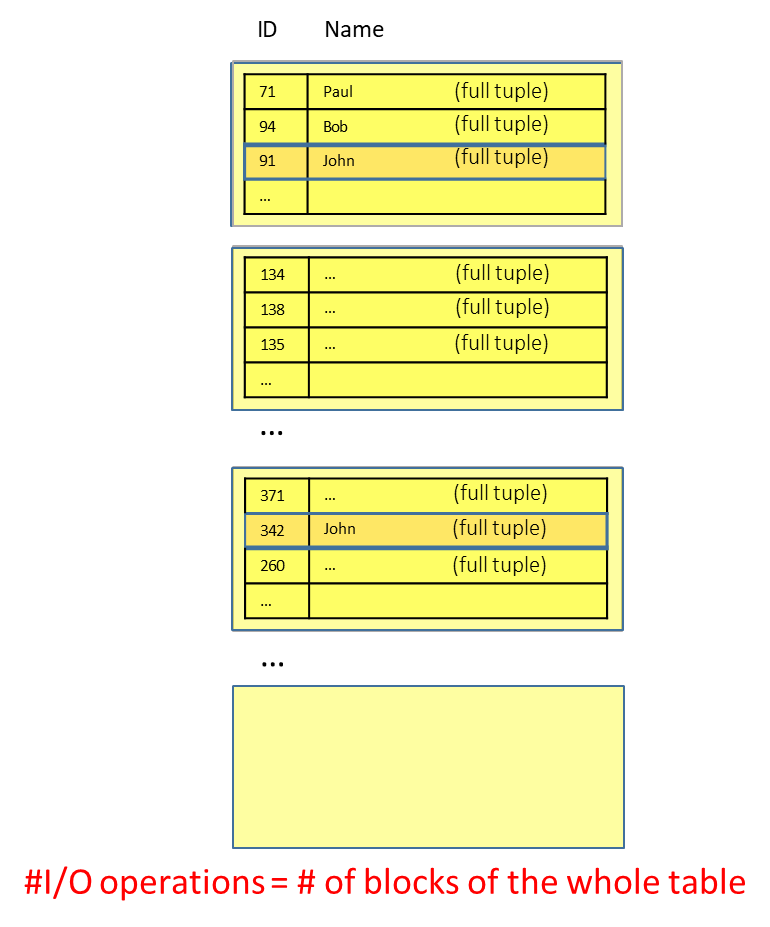 SELECT * FROM Student WHERE Student.Name = 'John', we may need to scan through every block until the desired tuple is found.
