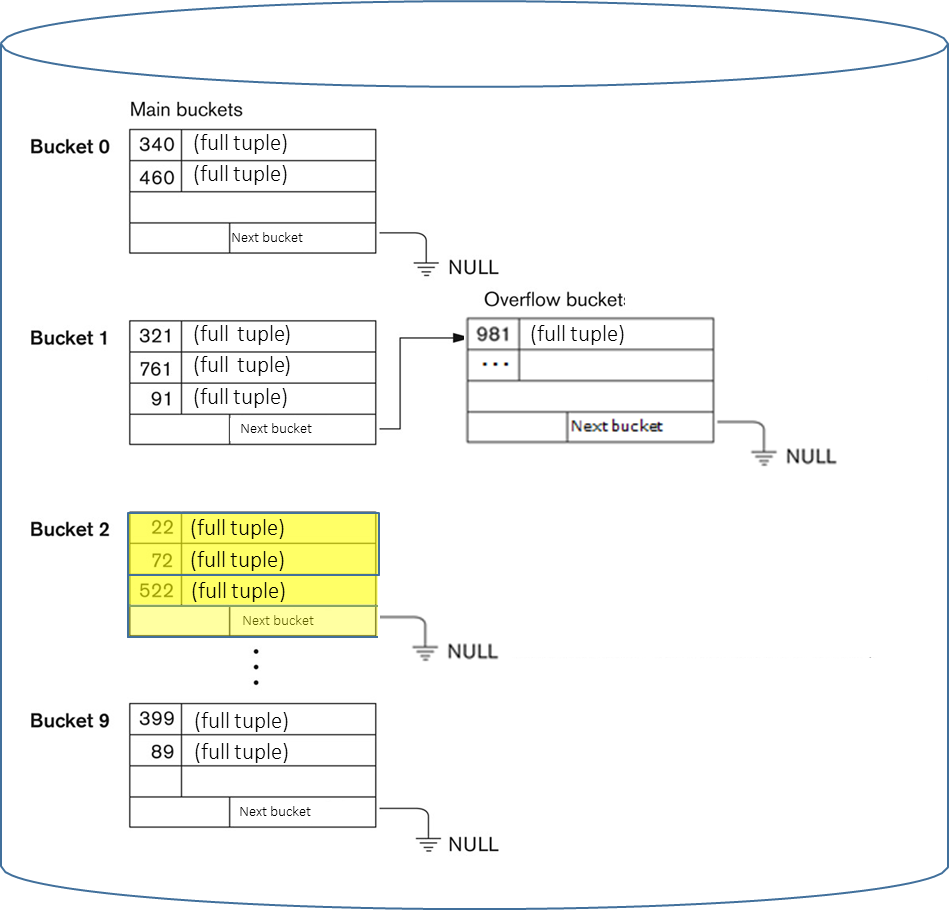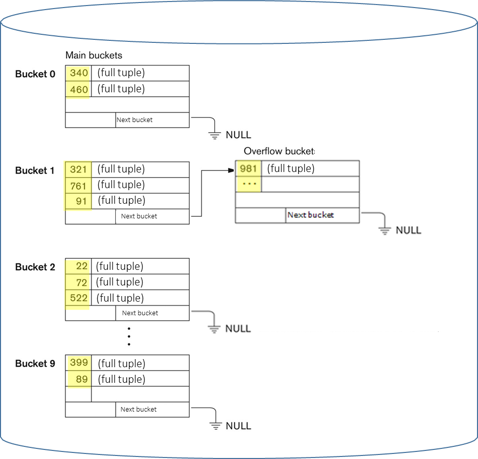 , is applied to the resulting integer. A common and simple hash function is the modulo operator, such as , where represents the total number of buckets in the hash table. This function maps the integer representation of the key to a bucket index in the range , determining the physical location where the corresponding tuple should be stored or retrieved.