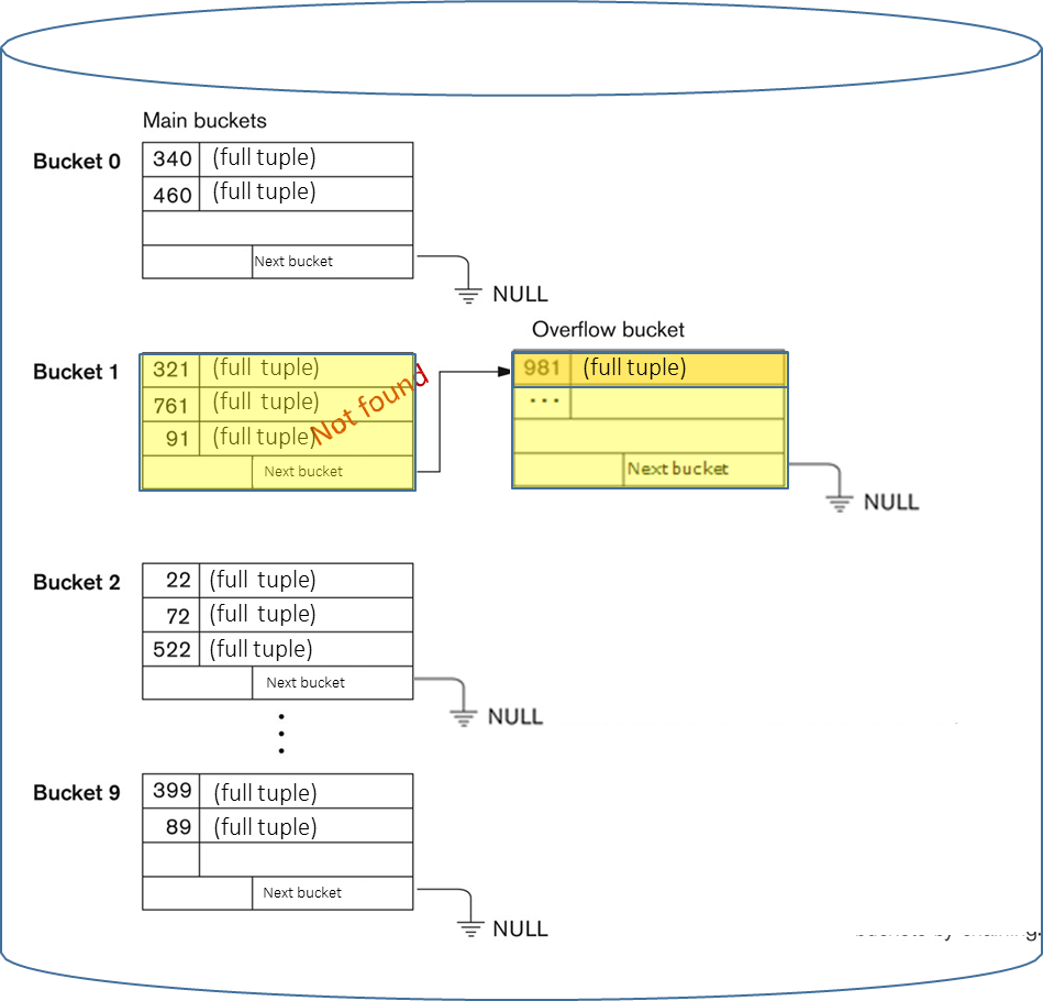 SELECT * FROM Student WHERE Student.ID = '981', the hash function computes. The system first checks bucket 1. If the tuple is not found, it will traverse the overflow chain linked to bucket 1, requiring additional I/O operations (so the number of I/O operations is 1 from the main bucket plus the average length of the overflow chain).