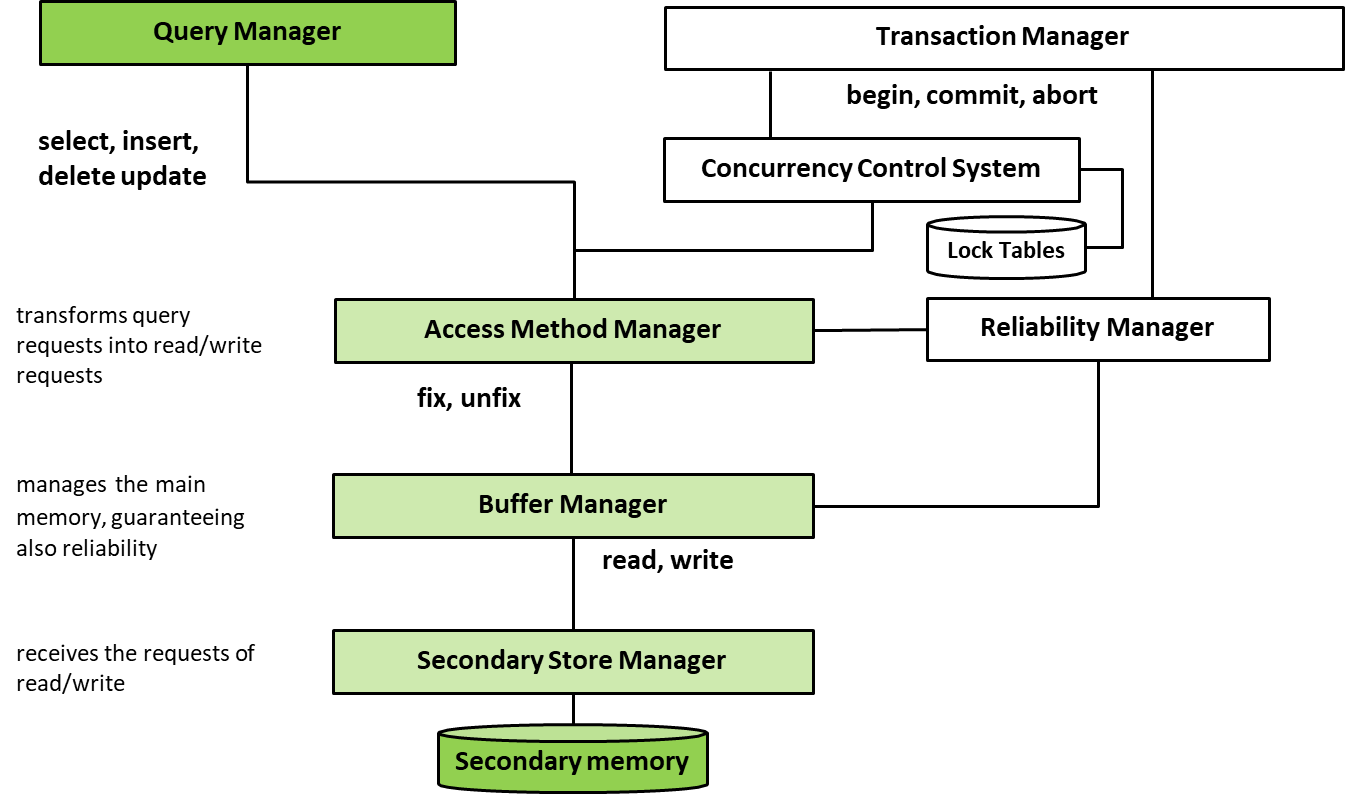 The buffer manager decides when to bring pages from secondary storage (disk) to main memory (RAM) and when to write modified pages back to disk.