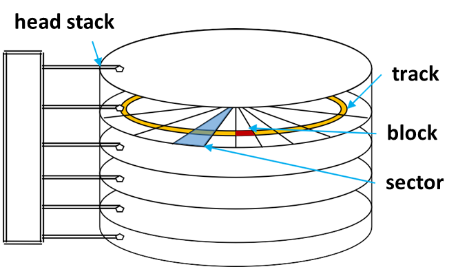 Mechanical hard drives consist of multiple disks (platters) stacked together, rotating at a constant angular speed. A head stack, mounted on an arm, moves radially to access tracks at different distances from the spindle (rotation axis). To read or write data, the drive waits for the desired sector to pass under one of the heads. Multiple blocks can be accessed simultaneously, corresponding to the number of heads/disks.