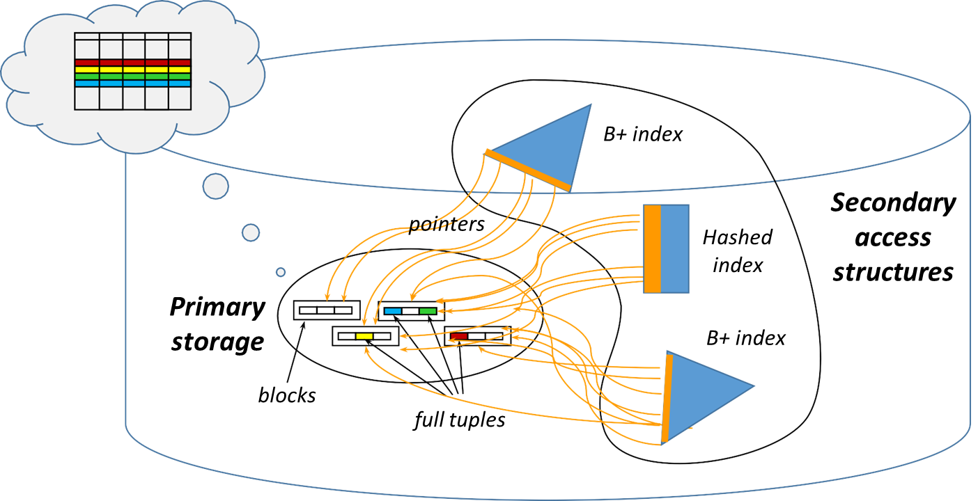 The primary structure is used mainly for storing the content of the table in a comprehensive and orderly way. On the other hand, secondary structures (indexes) are specifically designed to improve the efficiency of data retrieval by providing quick access to the primary structure. These secondary structures store only certain fields (such as search keys) along with pointers that direct the system to the corresponding blocks in the primary structure.